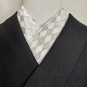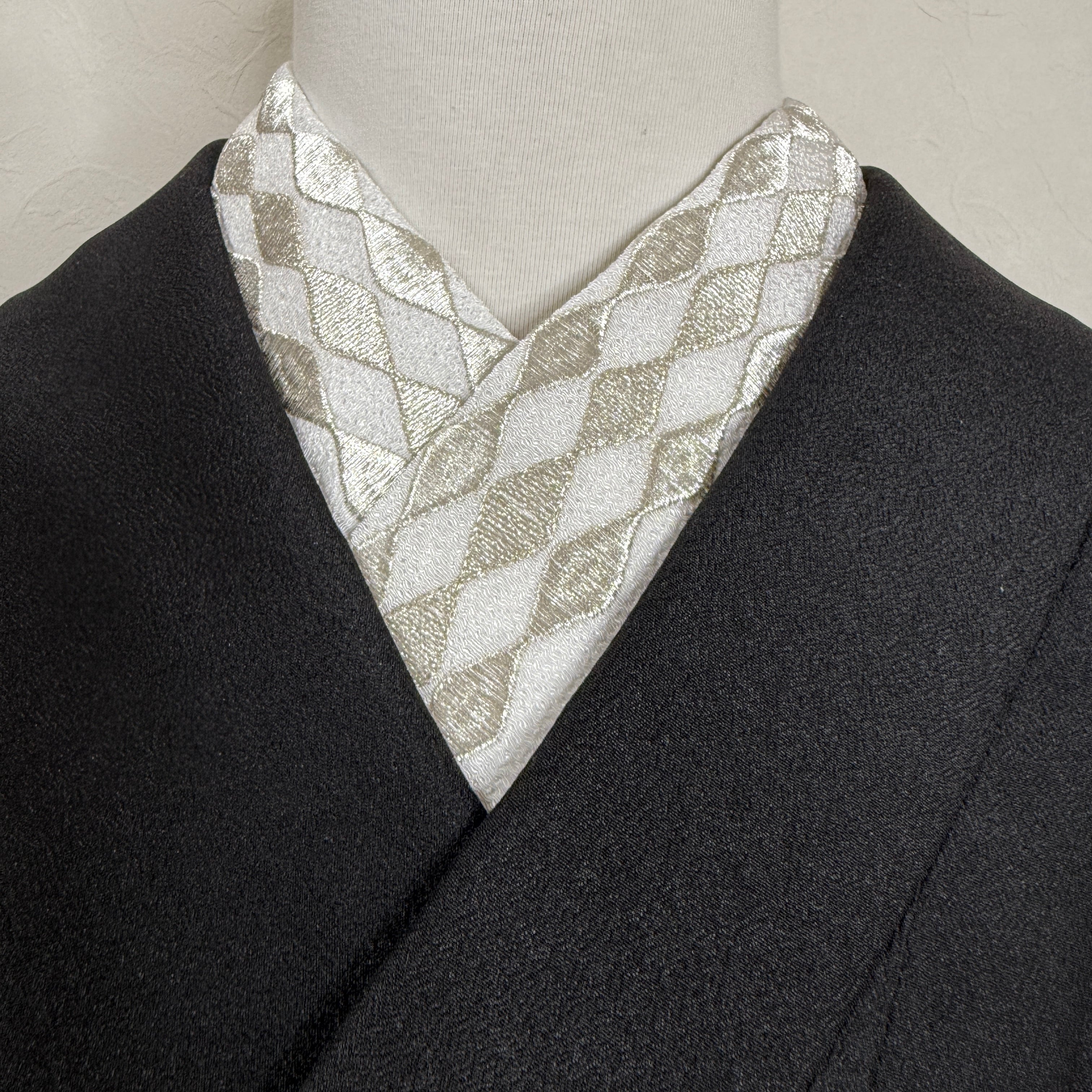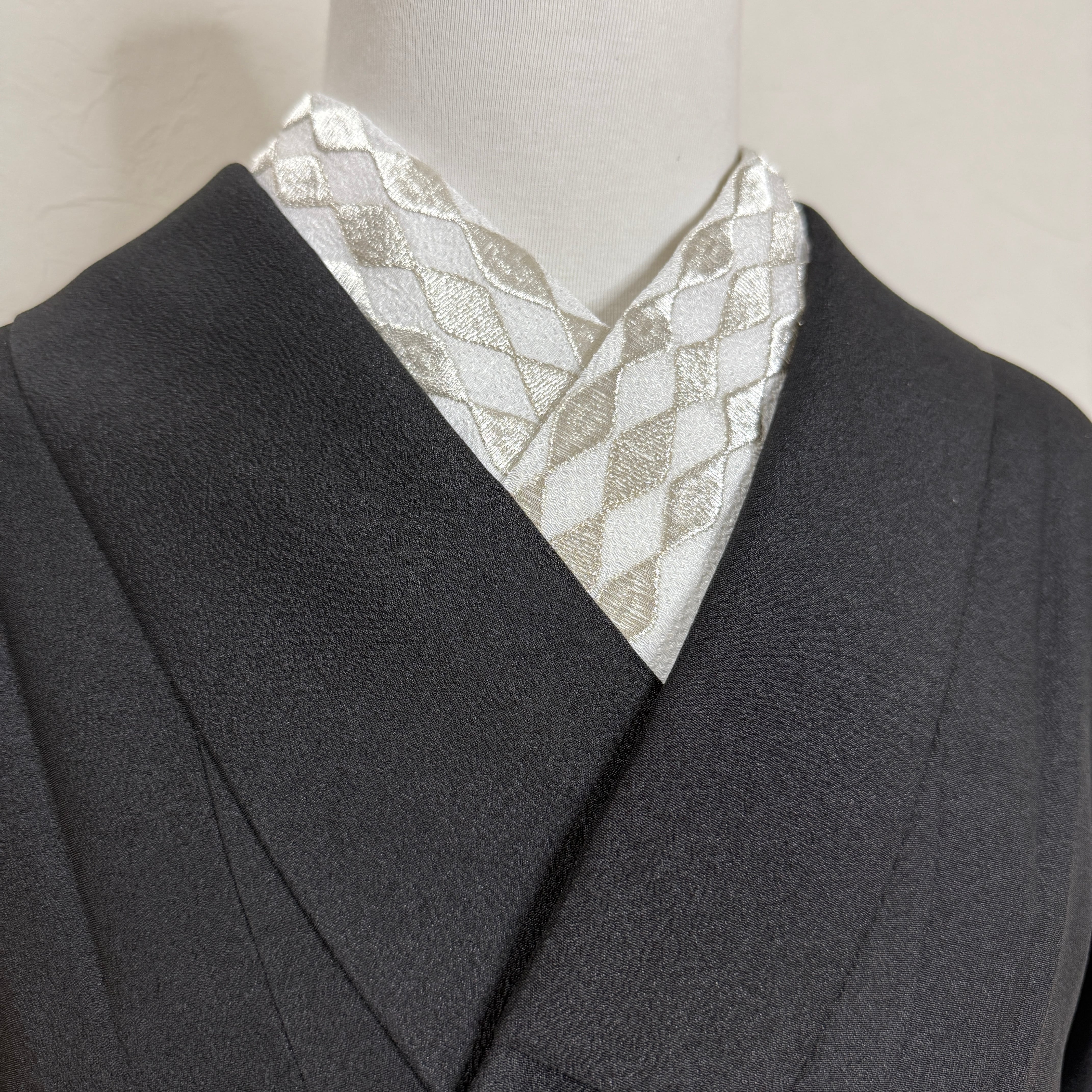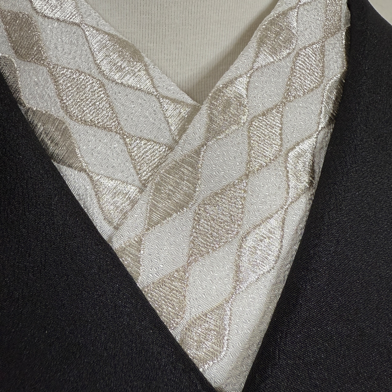 この半衿は、立涌模様の白地にシルバー刺繍が施されており、どんな着物にも合わせやすいデザインです。カジュアルなお出かけから、フォーマルなシーンまで幅広く活躍し、あなたの着物姿をより一層引き立てるアイテムです。エレガントな雰囲気が漂い、見る人を惹きつけます。