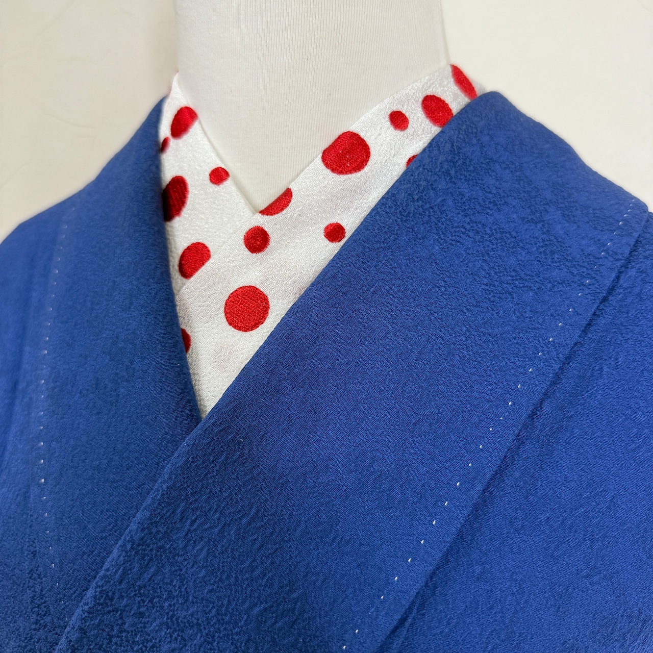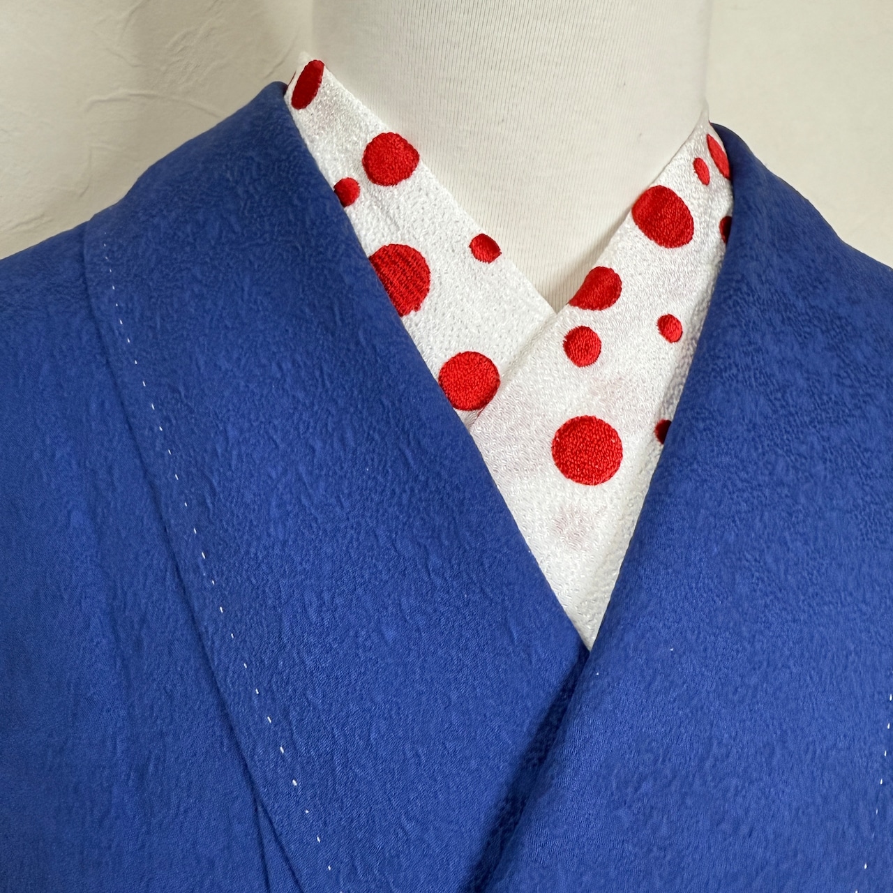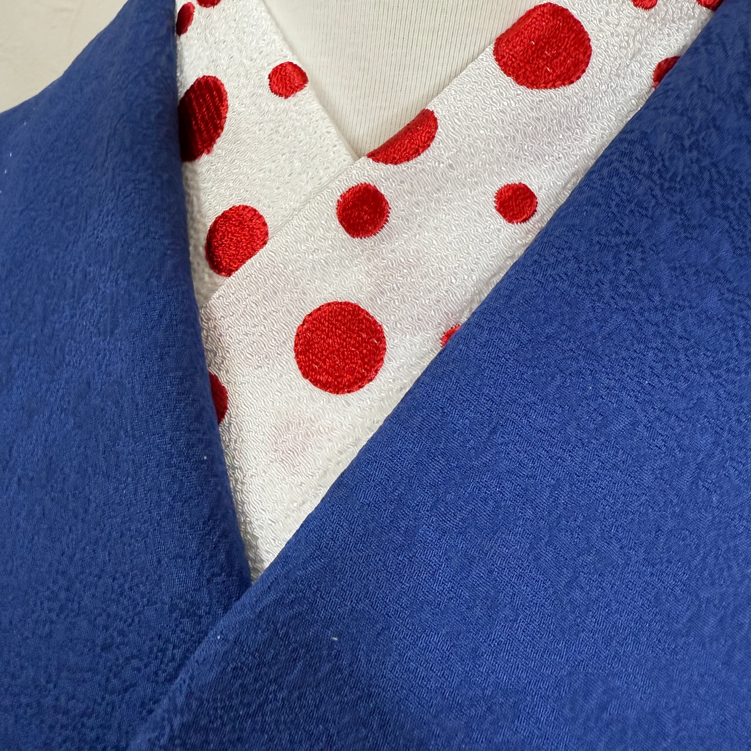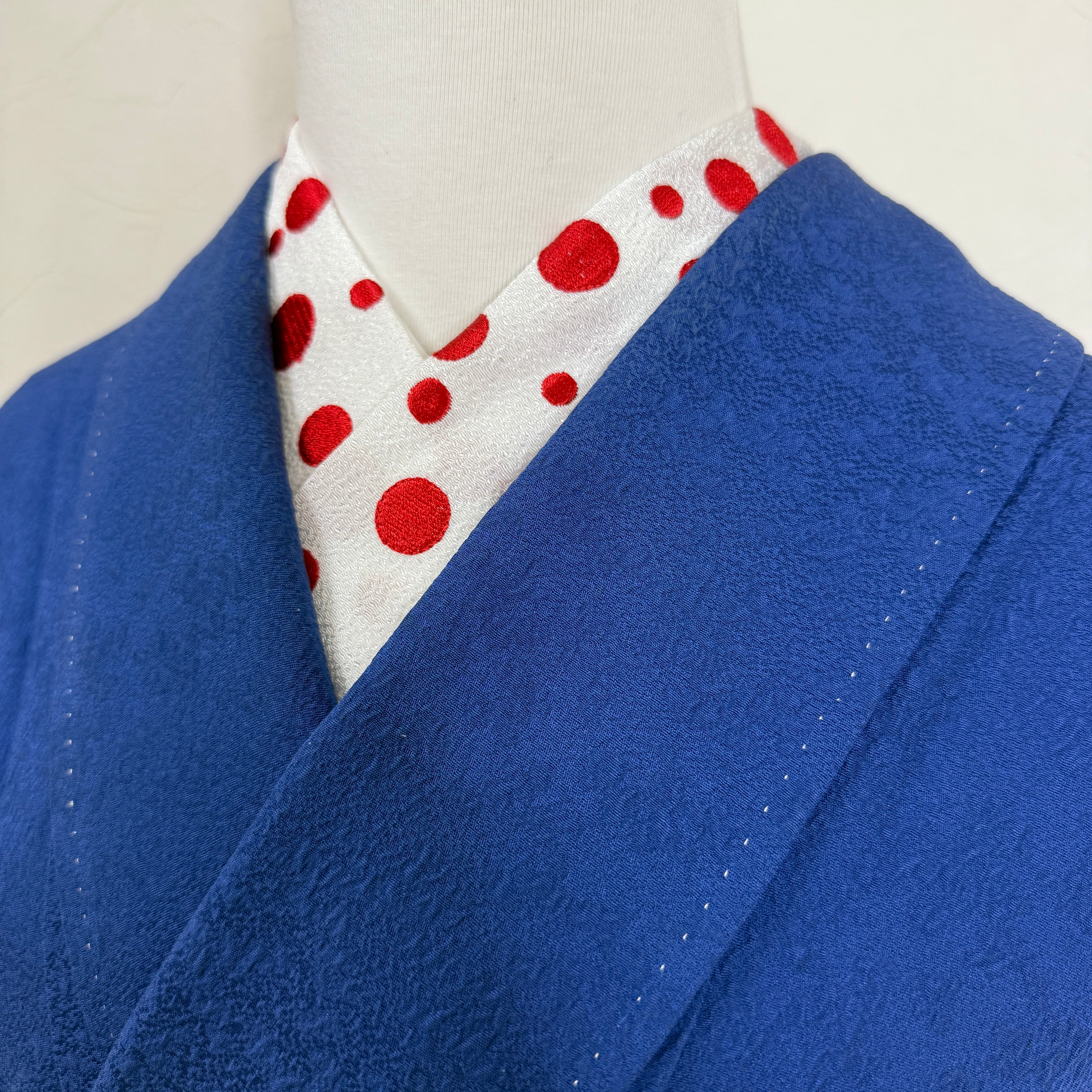 この半衿は、紅白のドット刺繍が施されており、多様な着物に合わせやすいデザインです。カジュアルなお出かけから、ちょっとしたお祝いごとまで幅広く活躍し、あなたの着物姿をさらに引き立てます。遊び心あふれる雰囲気が漂い、見る人の目を惹きつけます。