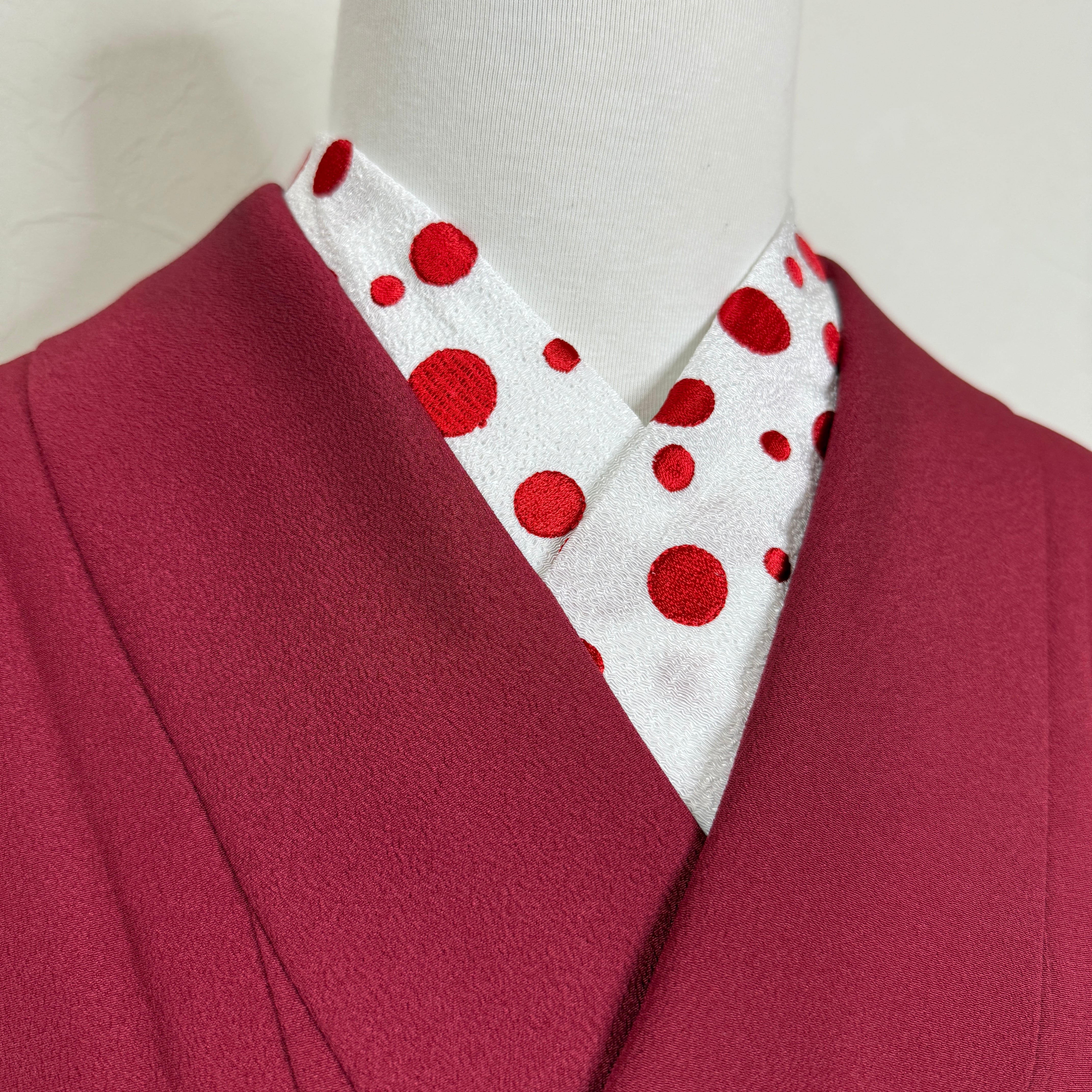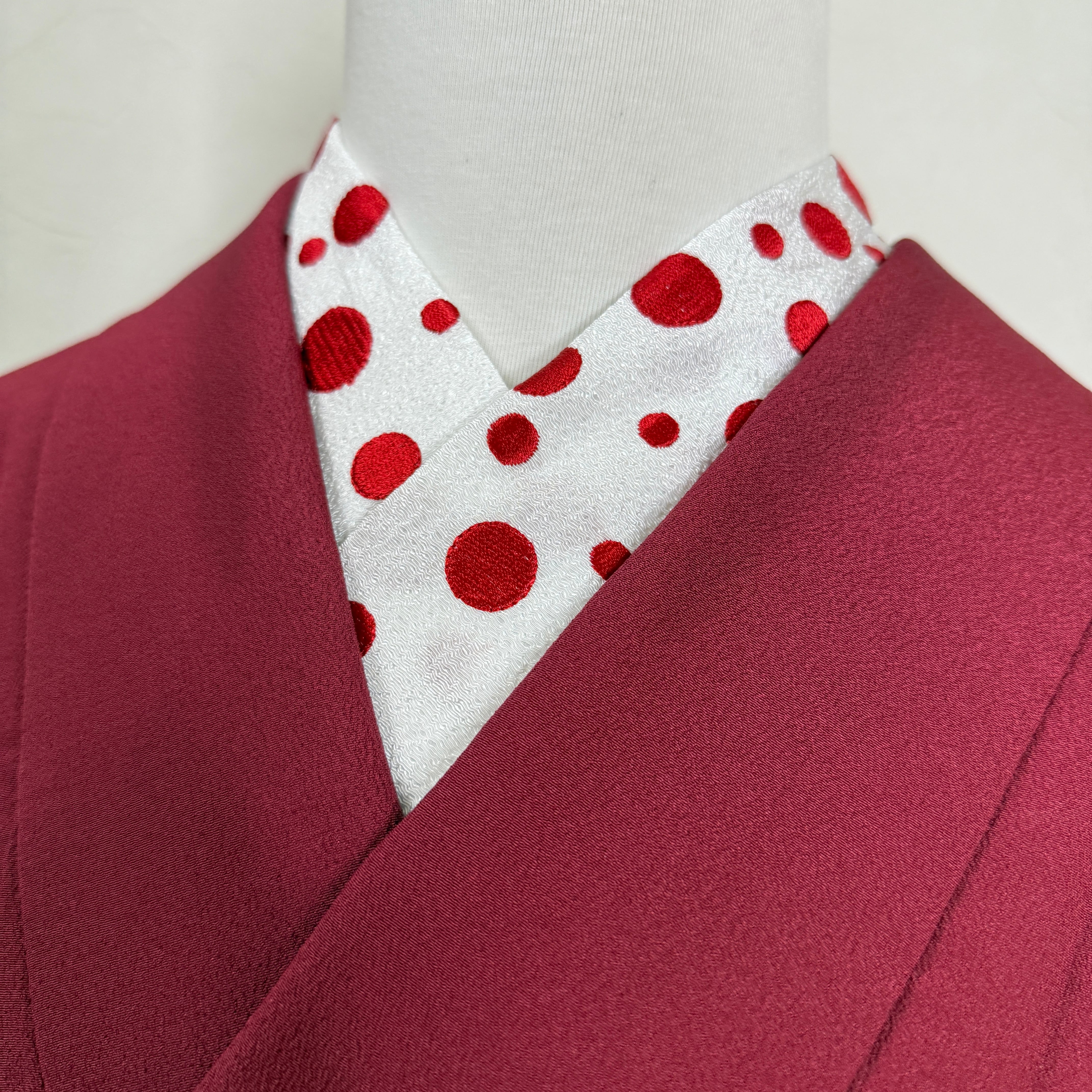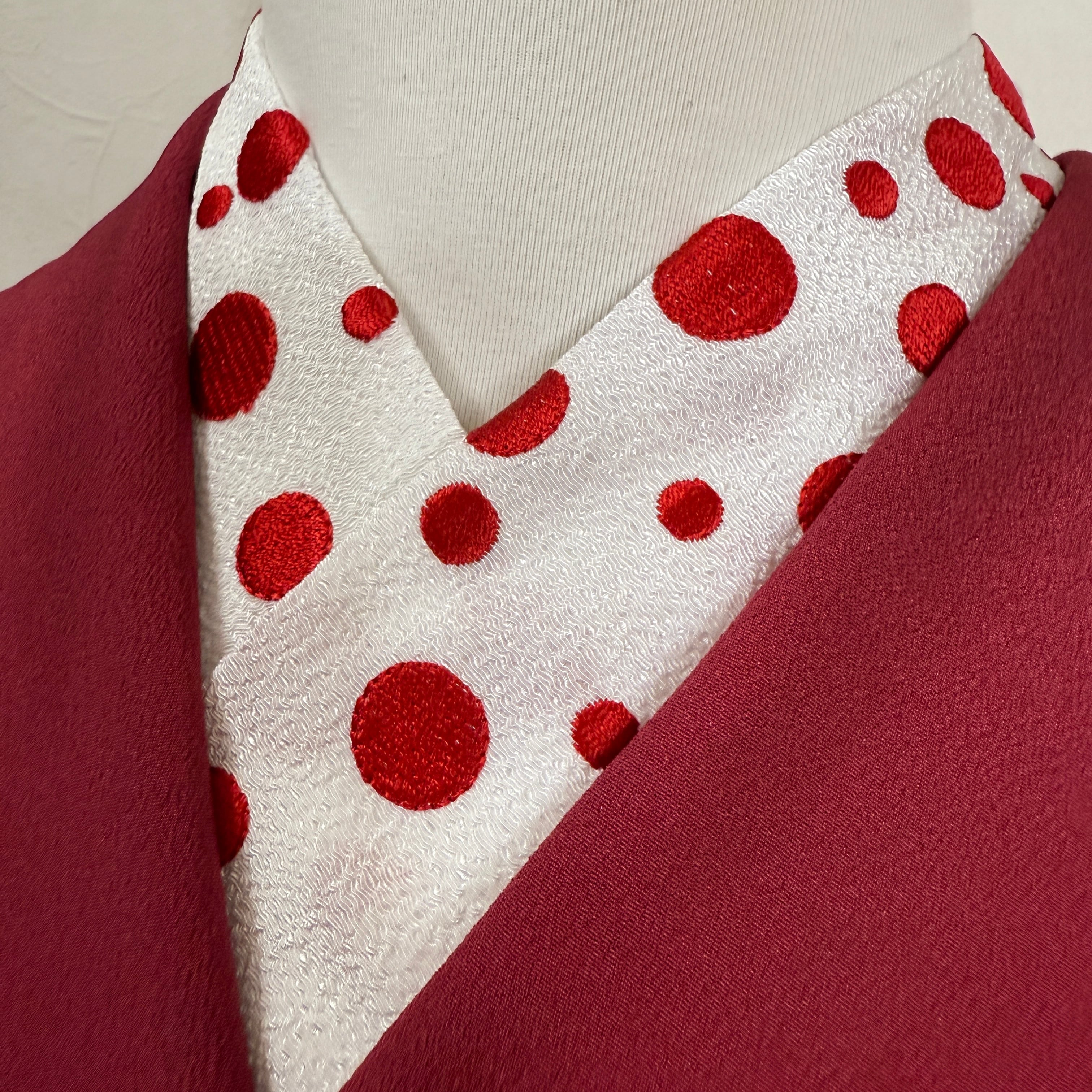 【オリジナル刺繍半衿】ドット紅白は、明るい紅と白のコントラストが特徴のアイテムです。この半衿を取り入れることで、伝統的な着物スタイルに楽しいエッセンスを加え、特別なお出かけにもとても便利です。